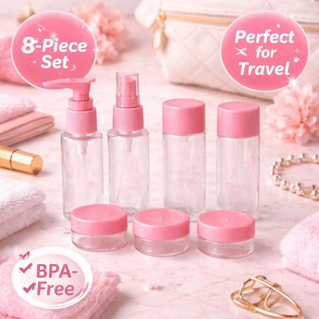 Upgrade your travel essentials with this 8-piece Travel Cosmetic Container Set in fresh mint green. Perfect for keeping lotions, creams, sprays, and serums neatly packed on the go, each set includes leak-proof bottles and jars designed for easy refilling and cleaning. Made from high-quality, BPA-free plastic, the containers are lightweight, reusable, and TSA-approved for hassle-free travel. Ideal for both men and women, this compact set slips easily into any travel bag or carry-on—keeping your favorite products organized and secure wherever you go.