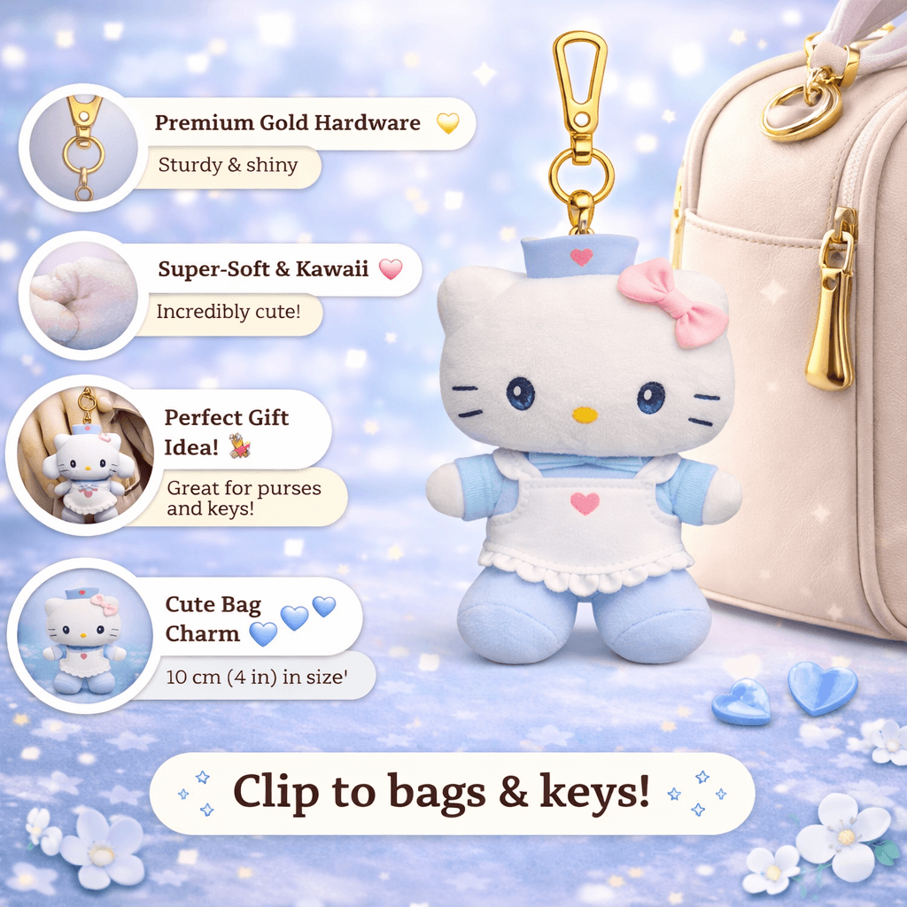 Designed with a soft plush material and charming cosplay details, this keychain showcases Hello Kitty wearing a nurse hat and outfit, giving it a playful and collectible look. The lightweight design makes it easy to carry while adding a fun kawaii aesthetic to your everyday accessories.