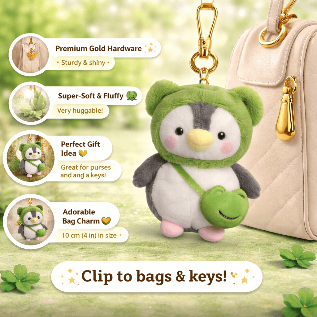 Add a fun and adorable touch to your accessories with the Plushiee Green Penguin with Fish Bag Keychain. Featuring a cute penguin character dressed in a green hoodie and carrying a tiny fish-shaped bag, this plushiee keychain is perfect for decorating handbags, backpacks, purses, and keys.
