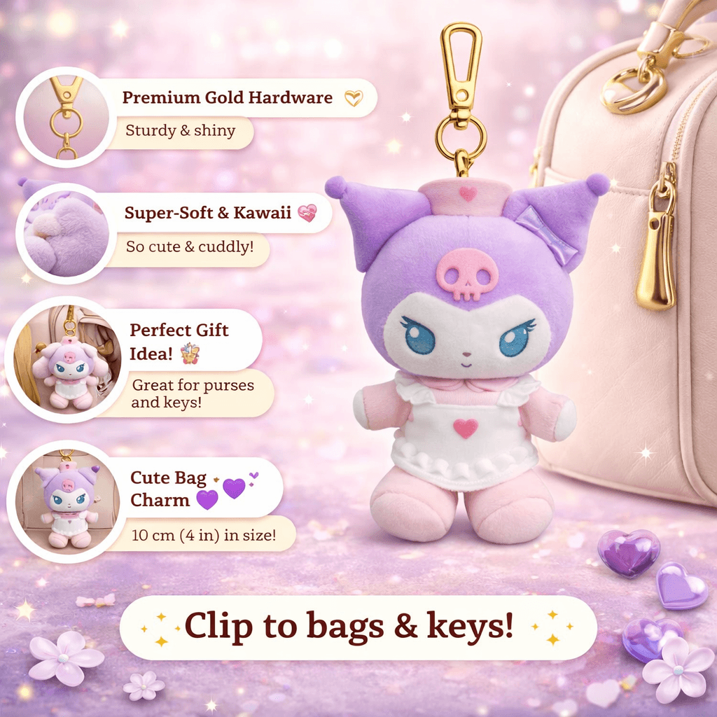 The Plush Kuromi Nurse Cosplay Keychain combines cute Sanrio character design with soft plush comfort, making it a perfect accessory to personalize your bags and keys with playful kawaii style.