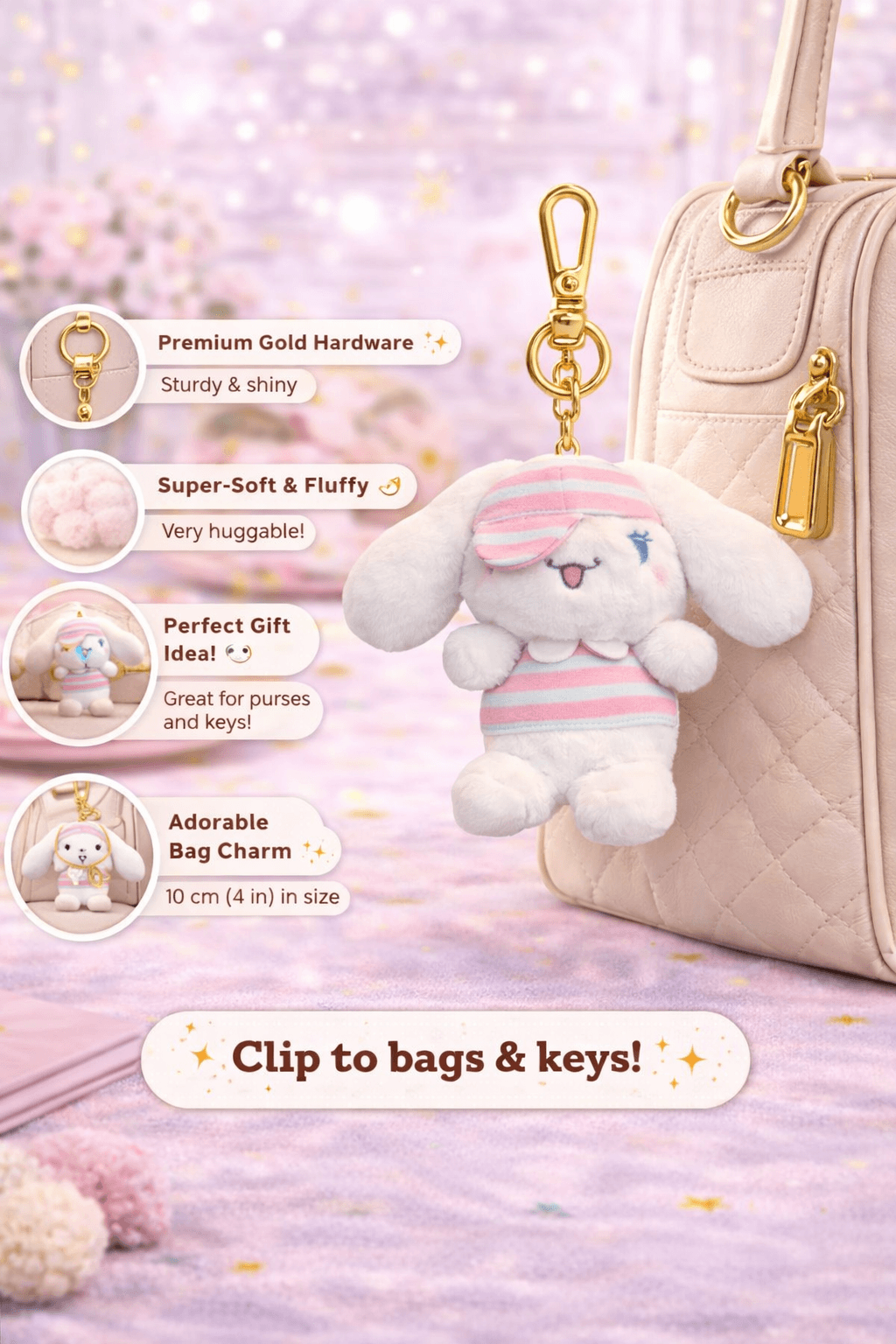 Made with soft plush fabric, this Cinnamoroll keychain has a cuddly texture and charming character design that makes it both stylish and collectible. The pastel pink cap and striped outfit give the plush charm a sweet kawaii look that Sanrio fans will absolutely love.