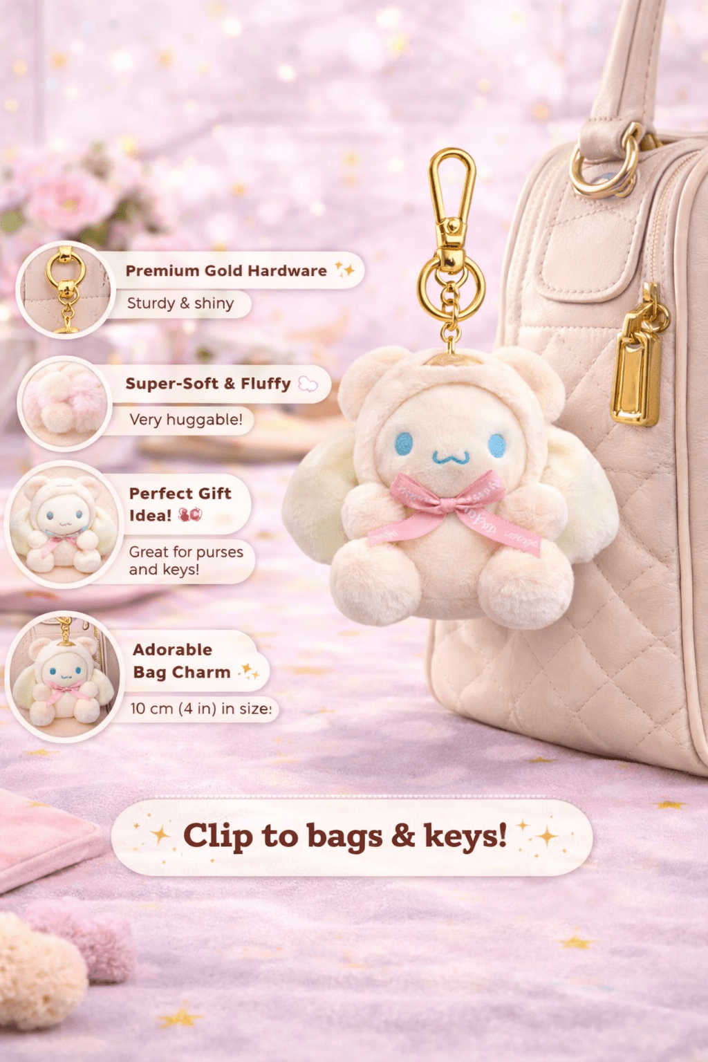Add a touch of adorable Sanrio charm to your accessories with the Sanrio Cinnamoroll Plush Keychain. Featuring the lovable Cinnamoroll character dressed in a cute plush teddy-style outfit with a soft bow detail, this charming keychain is perfect for decorating handbags, backpacks, purses, and keys.