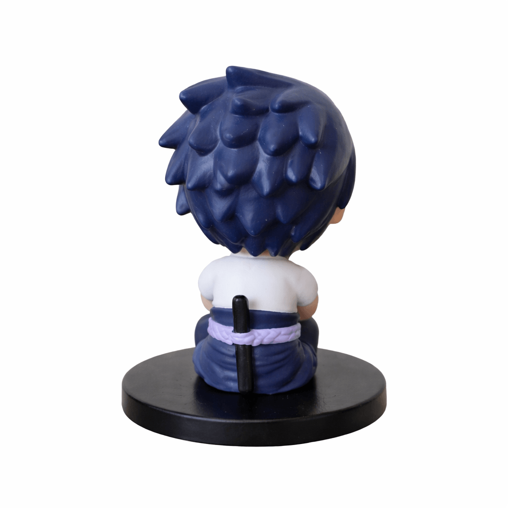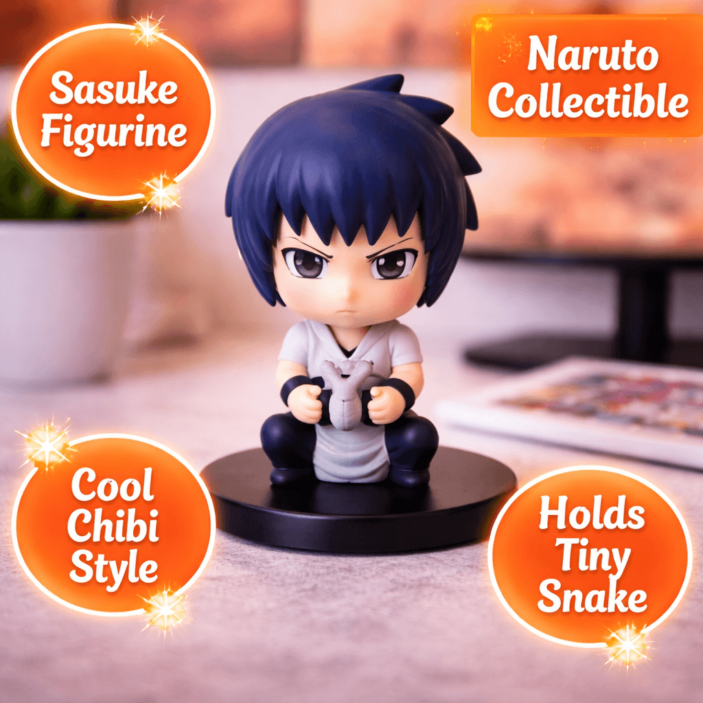 Capture the determined spirit of Sasuke Uchiha with this chibi-style figurine from the Naruto series. Featuring Sasuke with his characteristic dark blue spiky hair and intense gaze, this miniature figurine shows him sitting while holding a small grey snake, symbolizing his connection with Orochimaru and his unique fighting style.