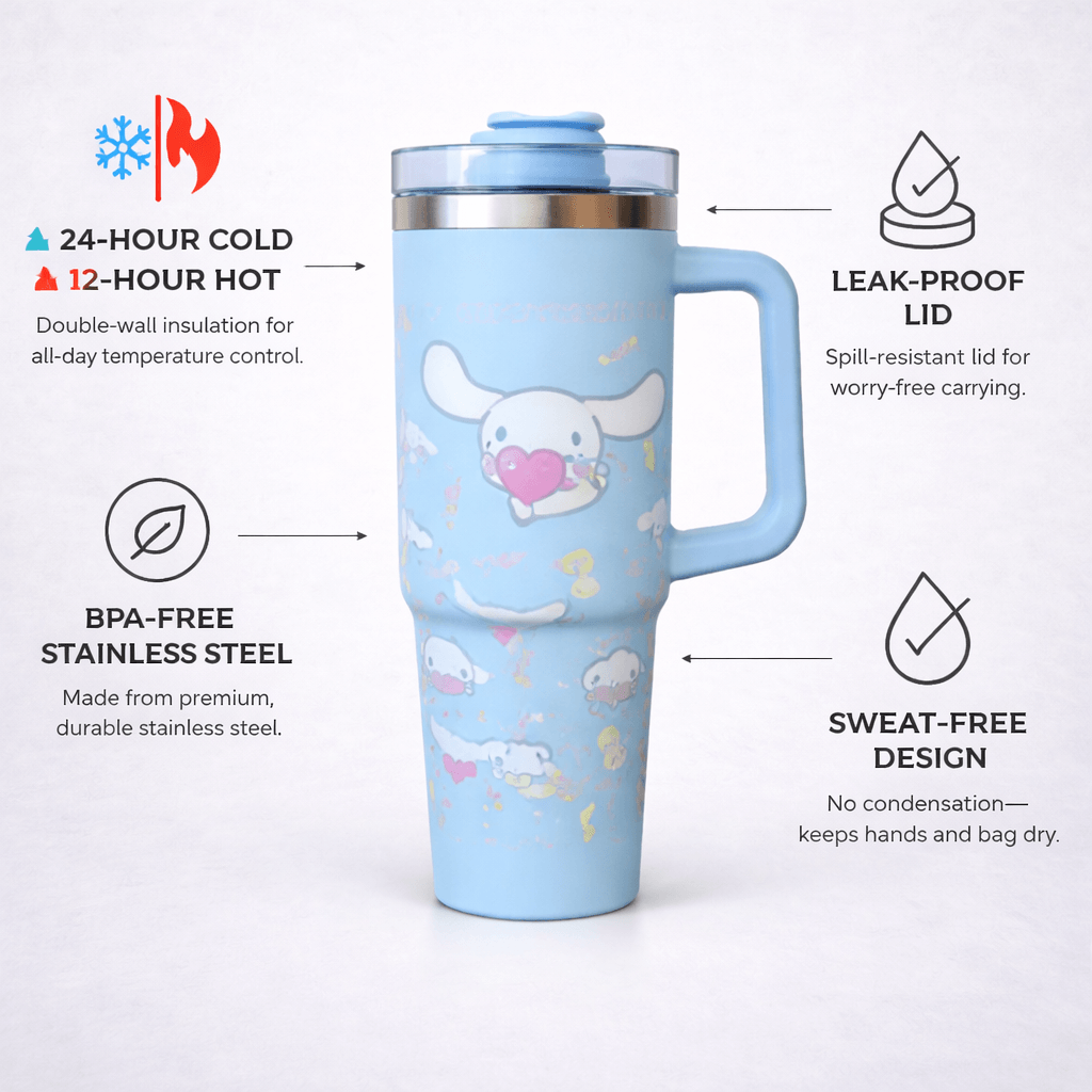 Bring sweetness and smiles wherever you go with this charming Cinnamoroll 40 oz Travel Mug! Decorated with dreamy cloud motifs, treats, and Cinnamoroll himself, this tumbler is perfect for fans of Sanrio's most lovable pup. The large size, comfy handle, and stainless-steel insulation make it your everyday hydration hero.