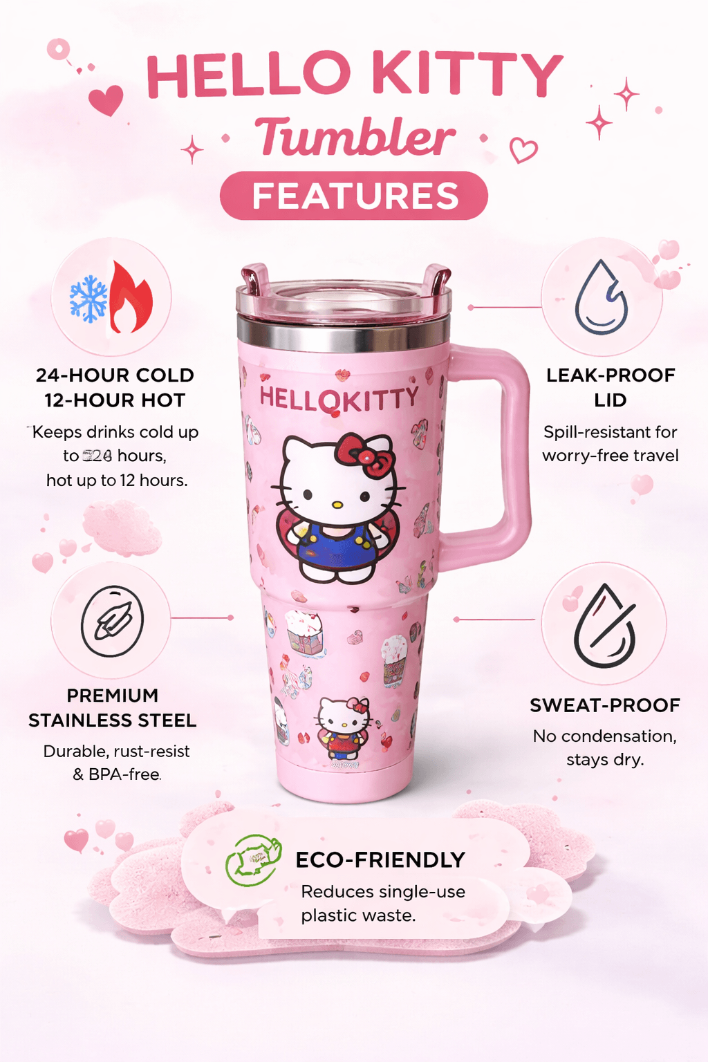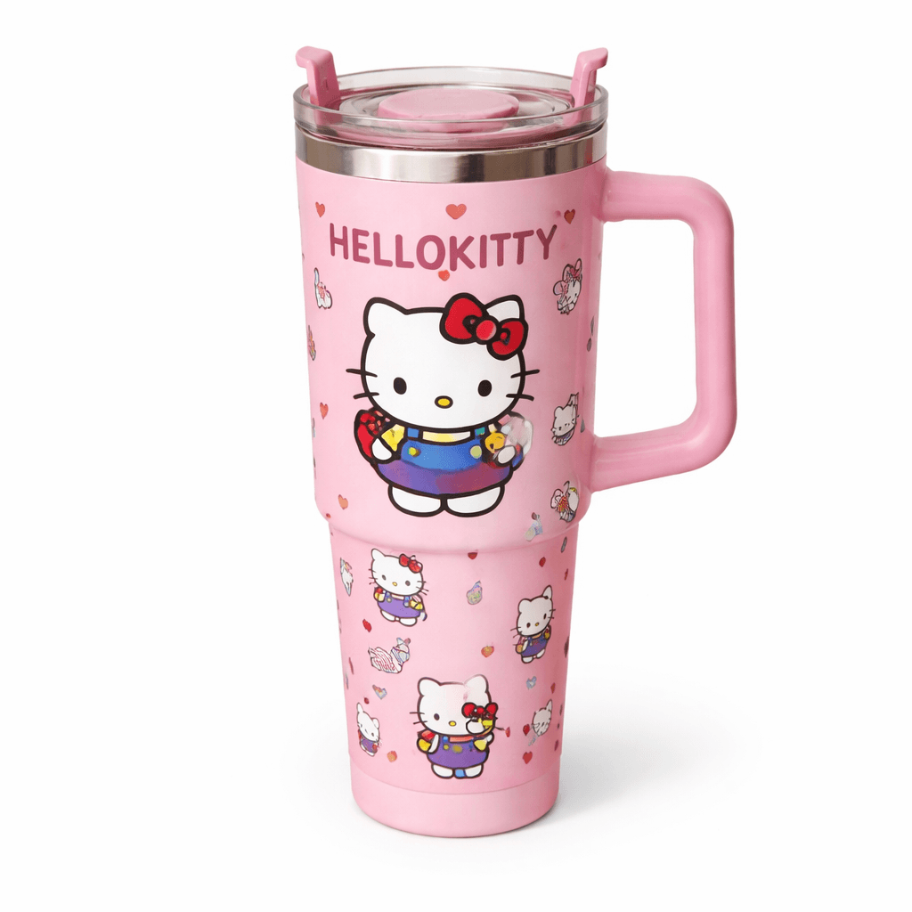 Sip in style with this adorable Hello Kitty Travel Mug! Featuring a bold design full of charm and hearts, this 40 oz tumbler is your kawaii go-to for hot or cold drinks. With a sturdy side handle and stainless-steel insulation, it’s perfect for long days on the go — whether you’re at work, class, or out adventuring.