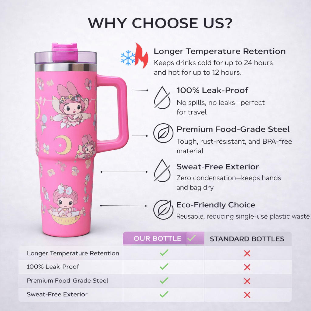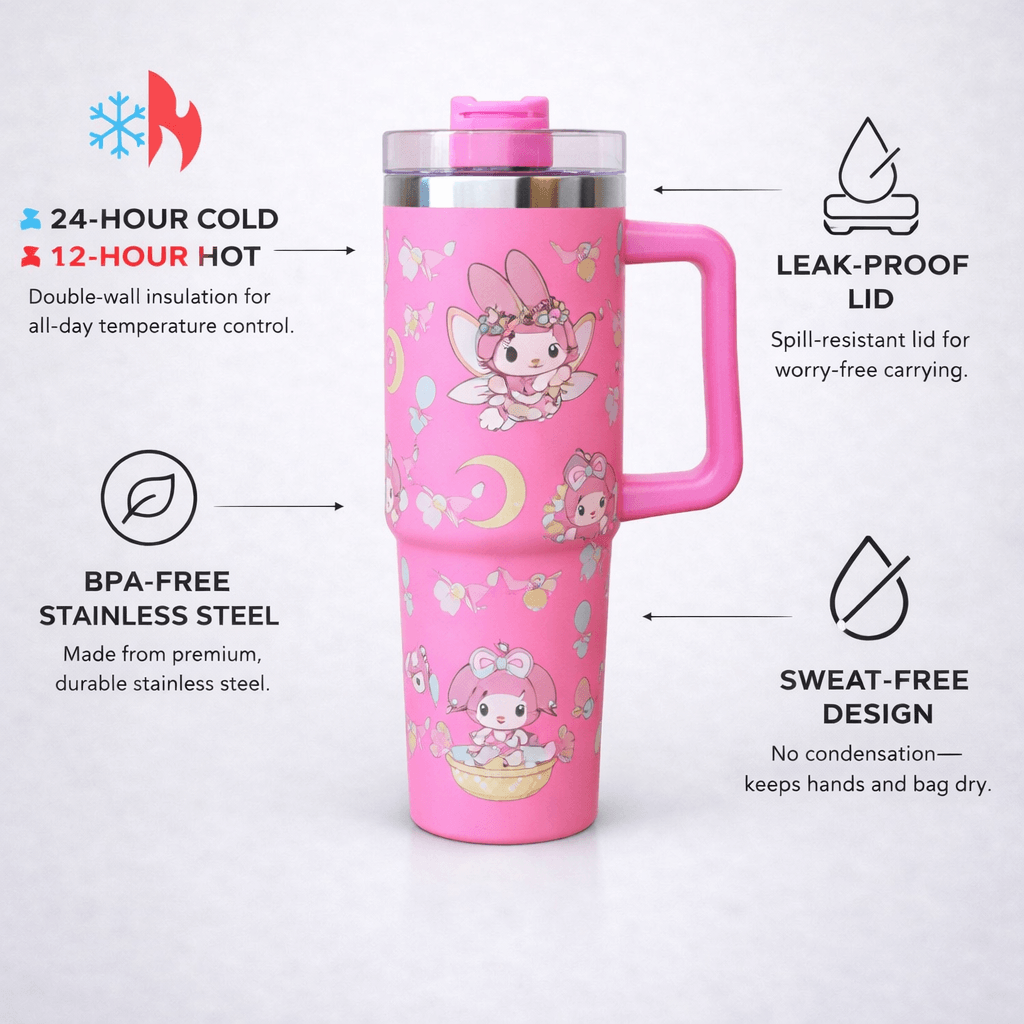 Add a pop of pink charm to your daily routine with this delightful My Melody 40 oz Travel Mug! Featuring floral crowns, moons, and adorable My Melody illustrations, this tumbler combines whimsy with practicality. The comfortable handle and stainless steel construction keep your drinks hot or cold for hours.