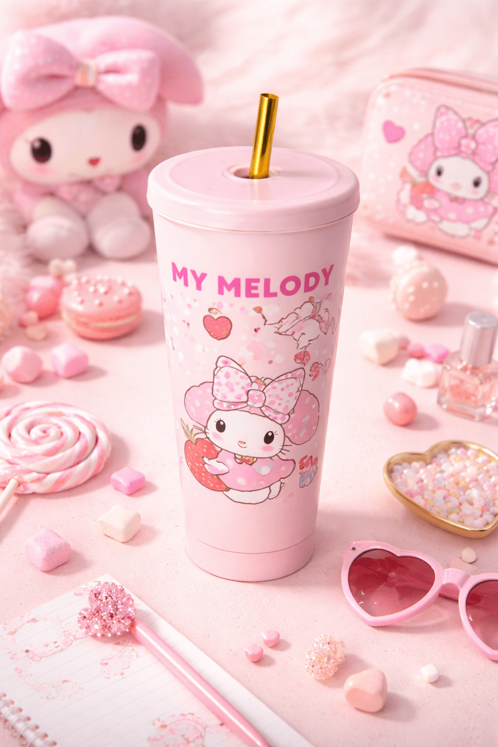 Add a touch of sweetness to your sips with this adorable My Melody Pink Tumbler! Featuring My Melody with her signature bow, strawberries, and hearts, this kawaii drinkware is the perfect accessory for Sanrio fans who love everything cute and pink.