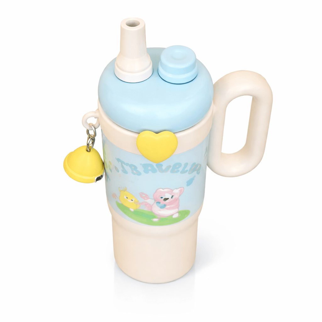 Fuel your child’s imagination and hydration with this charming travel-themed cartoon tumbler! Featuring a lovable pink bear and yellow bunny in a grassy park scene, this pastel blue and cream 16 oz tumbler is made with kids in mind. It includes a flip-up straw lid, secure cap, and a large ergonomic handle for tiny hands. With fun extras like a yellow heart button and matching bell charm, it's both functional and adorable — perfect for school, daycare, or adventures on the go.